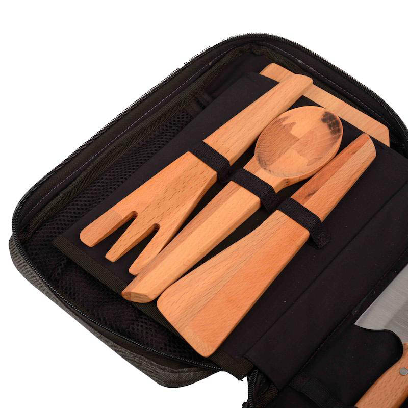 به علاوه قاشق، چنگال، برگردان چوبی و کیف حمل.