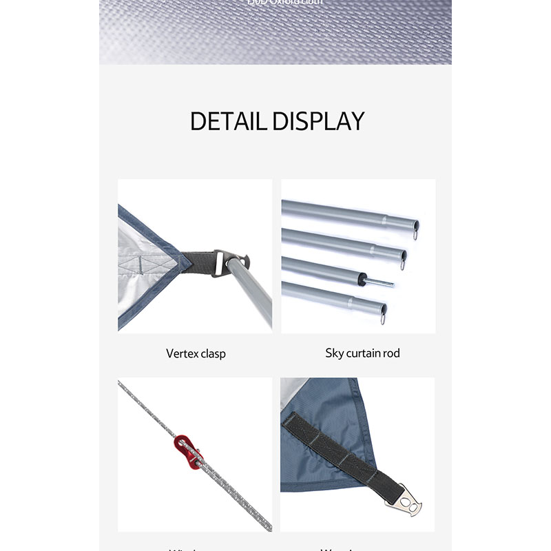 بدنه سایبان از پارچه آکسفورد 150D ساخته شده که علاوه بر وزن مناسب، مقاومت بسیار خوبی در برابر پارگی، سایش و شرایط سخت محیطی دارد. این متریال برای استفاده طولانیمدت در طبیعت طراحی شده و عملکرد قابل اعتمادی ارائه میدهد.