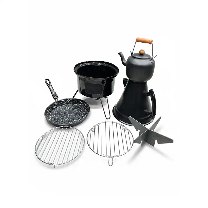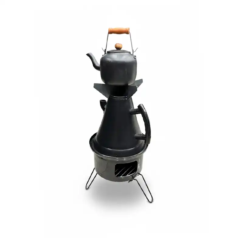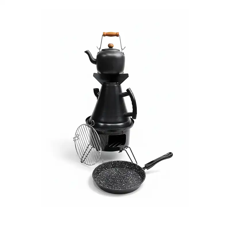 کتری این ست با ابعاد 23 × 21.5 سانتیمتر ساخته شده و با بهرهمندی از طراحی حفرهدار پیرامونی، جریان هوا را تقویت کرده و باعث افزایش حرارت و کاهش زمان جوش آوردن آب میشود. این ویژگی باعث میشود حتی با زغال یا آتش ملایم نیز عملکرد ایدهآل داشته باشد.
