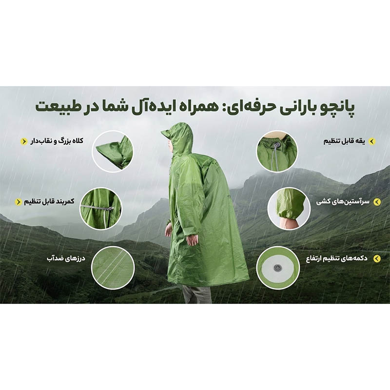 یکی از مهمترین ویژگیهای این پانچو، ضد آب بودن آن است—که آن را برای استفاده در بارانهای مداوم و مناطق مرطوب بسیار مناسب میکند. این ویژگی به شما کمک میکند تا هنگام کوهنوردی یا پیادهروی طولانی در طبیعت، خشک و راحت بمانید و از تجهیزات و لباسهای خود به خوبی محافظت کنید. کمپ شاپینگ | لوازم کوهنوردی و طبیعت گردی